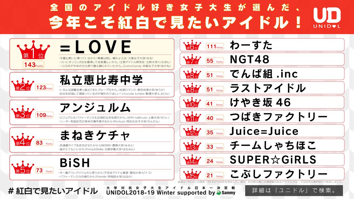 全国のアイドル好き女子大生が選ぶ『今年こそ紅白で見たいアイドルランキング』発表!!! 1位は ! 1: 2018/11/14(水) 23:04:59.79 .net 続きを読む COME ON!! Share this post