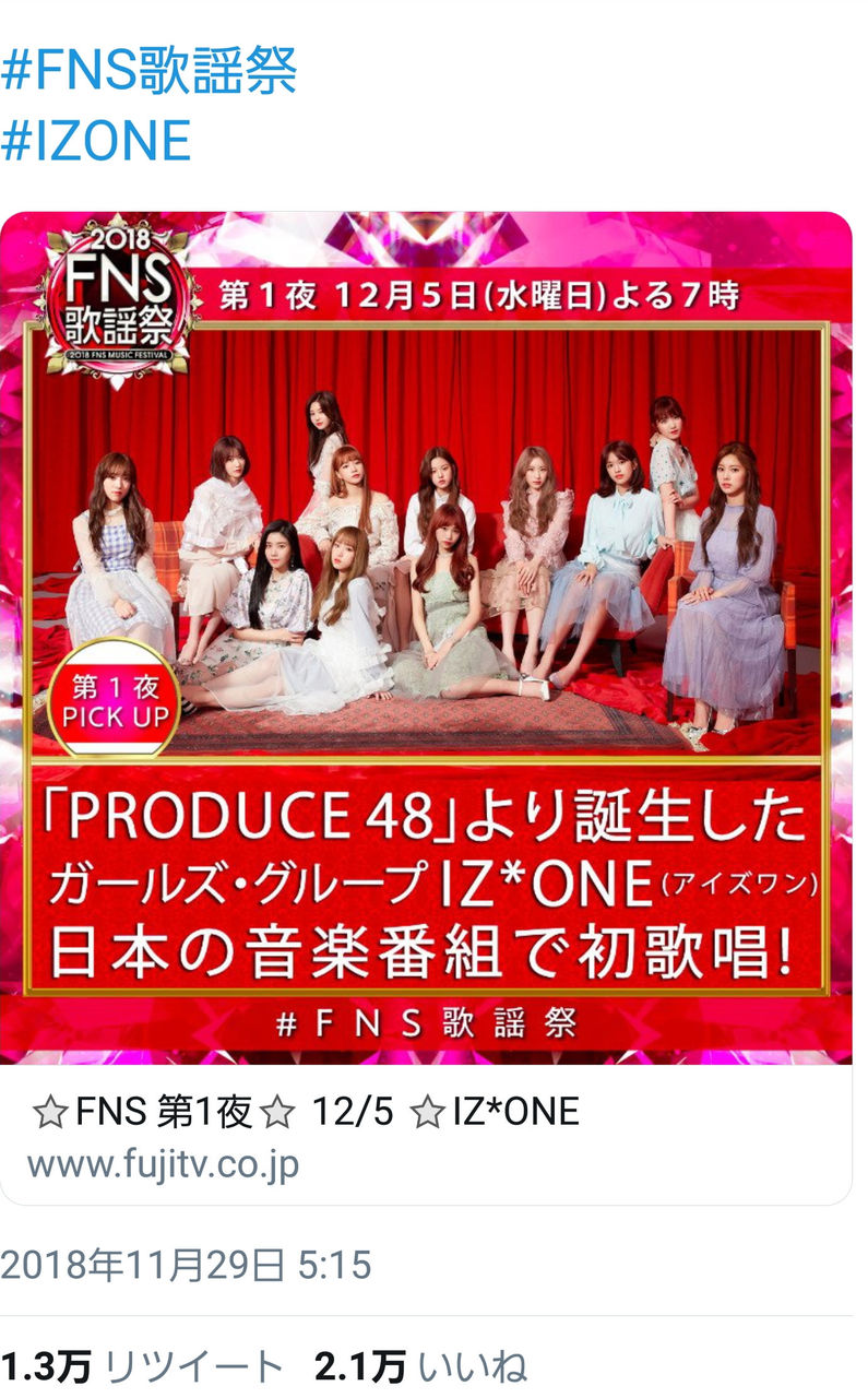【朗報】IZ*ONEの『FNS歌謡祭』出演決定が日本デビュー前の新グループとして異例の大反響!!! !