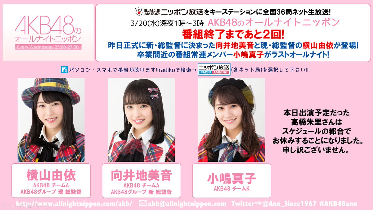 ニッポン放送「今夜のAKB48のANNに出演予定だった高橋朱里さんですがスケジュールの都合でお休みすることになりました」 !