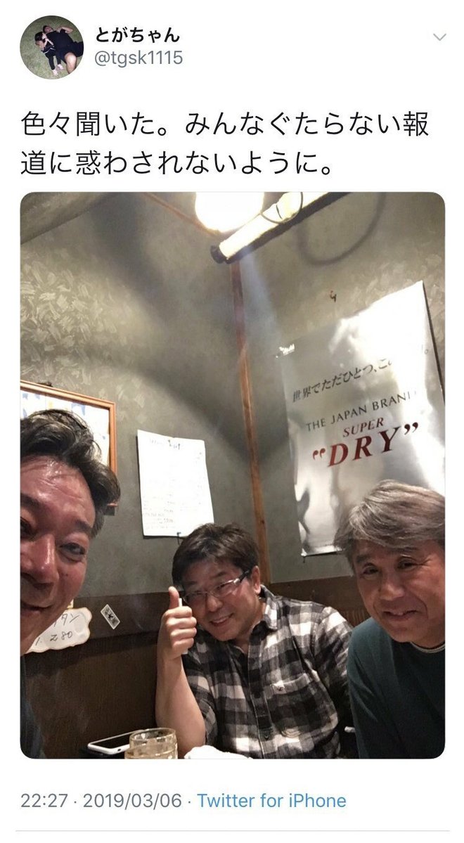 AKB48の元劇場支配人が6日、今村氏、細井氏と談笑する写真とともに「色々聞いた。みんなぐたらない報道に惑わされないように」(原文まま、現在は削除)とSNSに投稿していた。