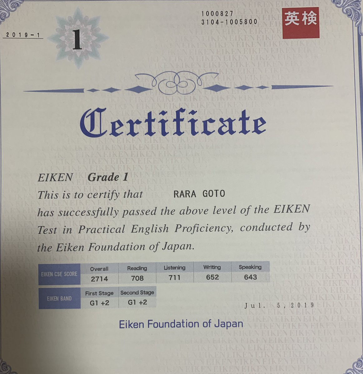 後藤楽々ちゃん英検一級合格 !