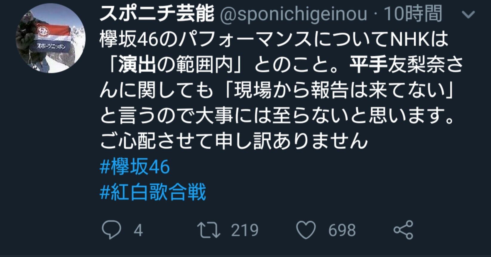 欅坂46のパフォーマンスについてNHKは「演出の範囲内」とのこと。平手友梨奈さんに関しても「現場から報告は来てない」と言うので大事には至らないと思います。ご心配させて申し訳ありません